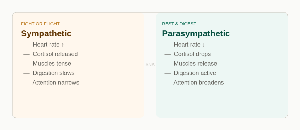 The sympathetic branch mobilises resources: it raises heart rate, floods the body with adrenaline and cortisol, redirects blood to the muscles, and sharpens short-range focus. The parasympathetic branch — often called “rest and digest” — does the opposite. It slows the heart, activates digestion, lowers blood pressure, and creates the conditions in which the body can repair itself.