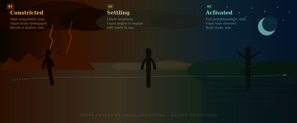 When you slow your breathing during a guided session, you’re doing something physiologically precise. Research published in PMC identifies slow, extended exhalation as the primary mechanism of what scientists call respiratory vagal nerve stimulation — a direct, rhythmic activation of the vagus through breath pacing. The exhale is the key moment: it’s when the heart rate naturally drops and the parasympathetic system asserts itself. A longer exhale means a longer window of vagal engagement.