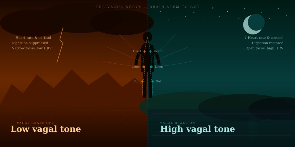 one of these require equipment, a dedicated hour, or belief that they’re working. The vagus nerve responds to input, not intention. You give it the right conditions — slowed breath, body attention, the absence of perceived threat — and it does the rest. Over time, and with repeated practice, the range of your vagal tone expands. The stress response still fires when it needs to. It just stops running the show.